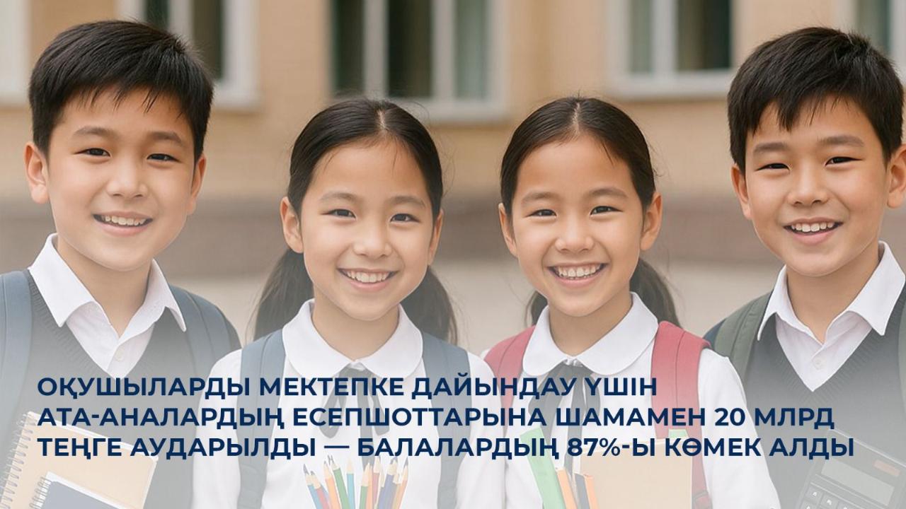 «Жалпыға бірдей білім беру» қоры аясында ата-аналардың және заңды өкілдердің есепшоттарына мектеп формасын, аяқ киім мен оқу-құралдарын сатып алу үшін шамамен 20 млрд теңге аударылды. Қолдау 430 мыңнан астам баланы қамтыды, бұл жалпы алушылар санының 87%-ына жуық.